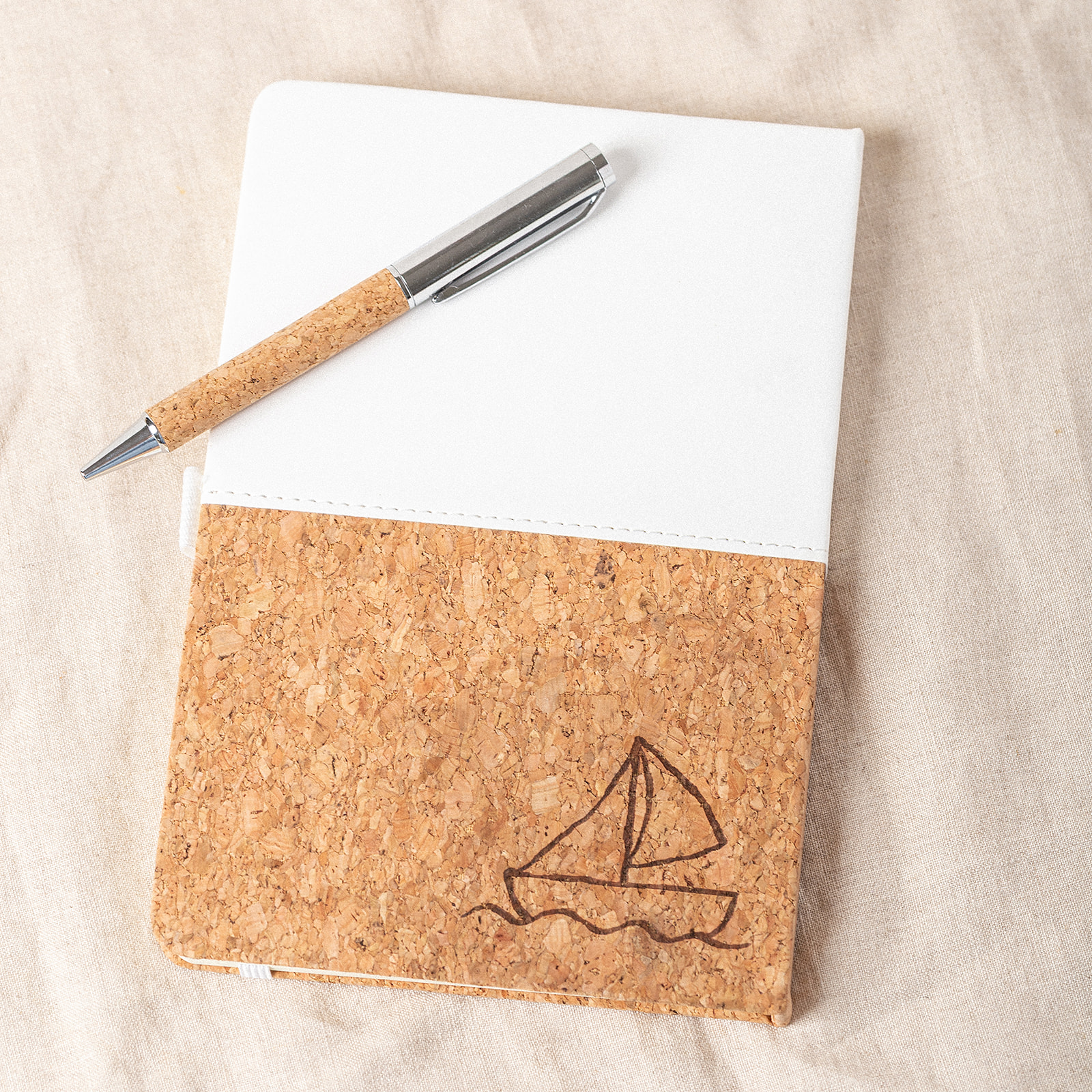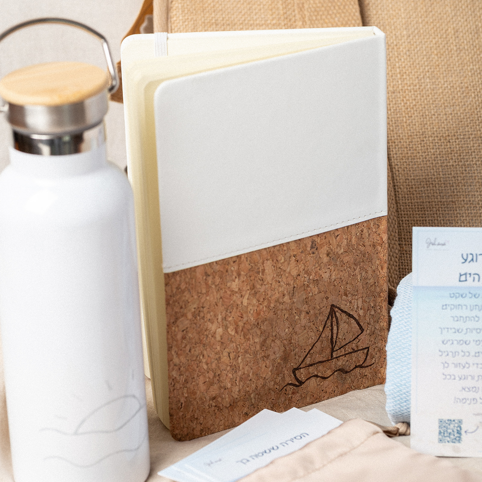 - עיצוב ייחודי ומעורר השראה: כריכת השעם הטבעית מעניקה תחושה נעימה למגע ומראה אקולוגי. בשילוב עם איורי חוף עדינים – גלים, סירת מפרש, גלשן – היא מעוררת תחושת חופש, רוגע ויצירתיות, והופכת כל כתיבה למסע קצר אל הים.
